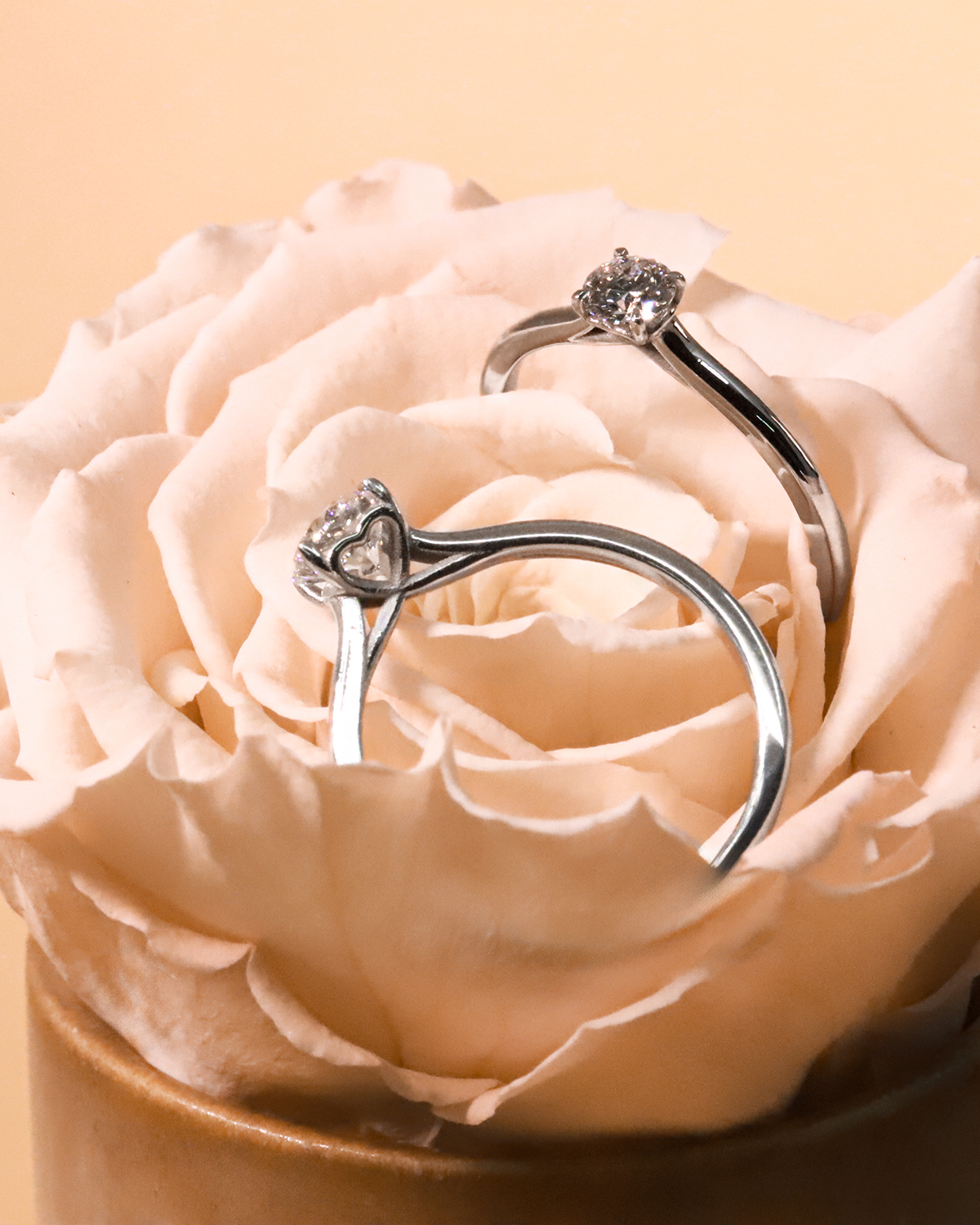 Le premier modèle de notre atelier, une monture à quatre griffes qui se joignent en un cœur discret, symbole d’union.