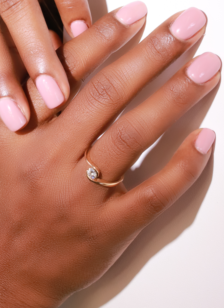 Création exclusive avec un diamant entrelacé par deux bras et sa monture courbée qui lui confère une aura plus libre et moins conventionnelle.
