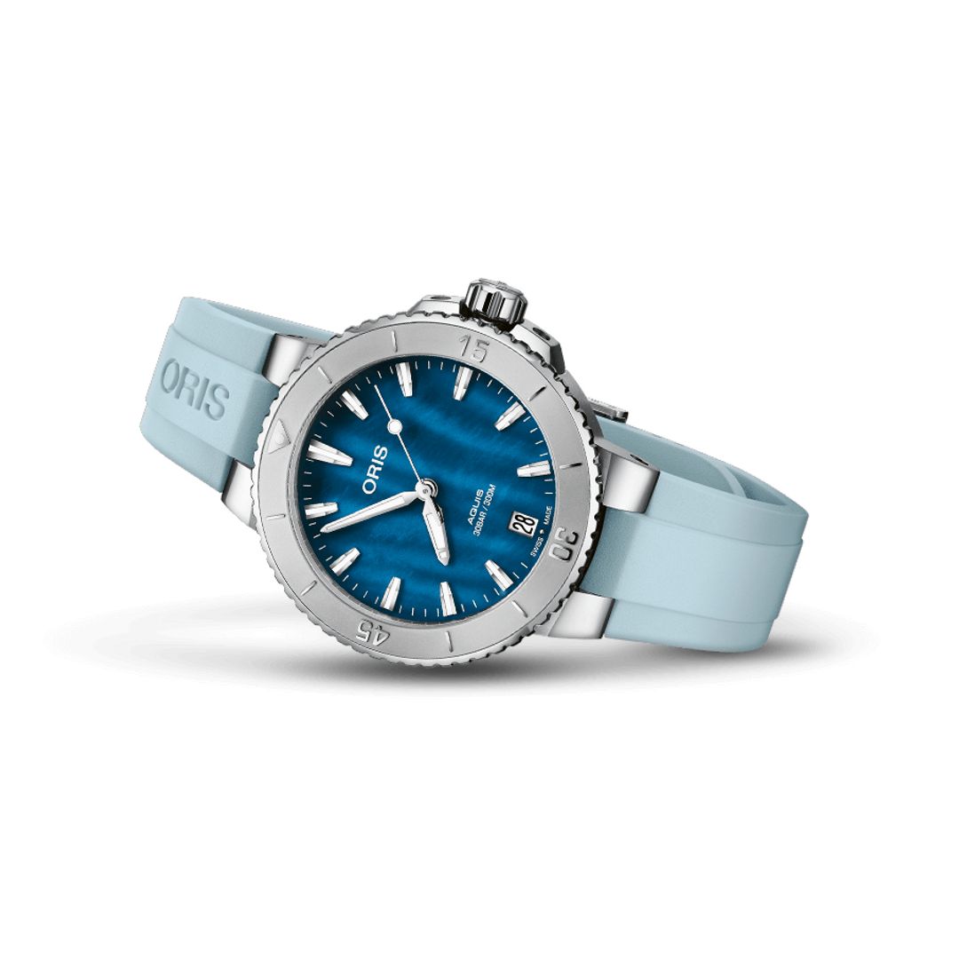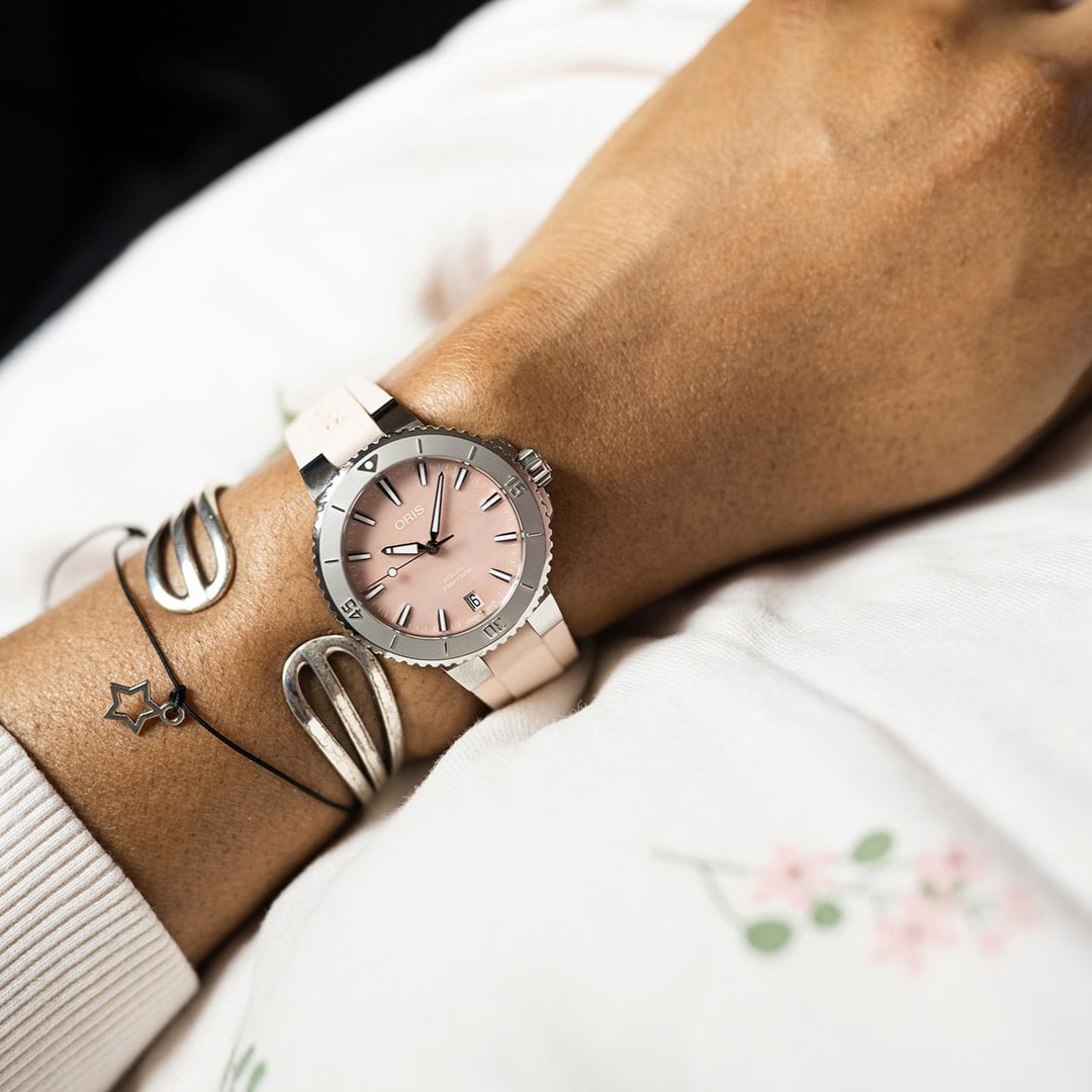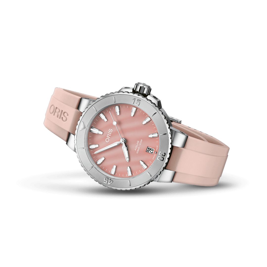 La montre de plongée Aquis Date, de couleur rose, se distingue par son cadran contrasté. Le cadran, réalisé en nacre, scintille comme le reflet du soleil sur l’eau, ajoutant de l’élégance à son profil performant. Cette montre, avec sa silhouette épurée, est une pièce unique dans la collection Aquis.
