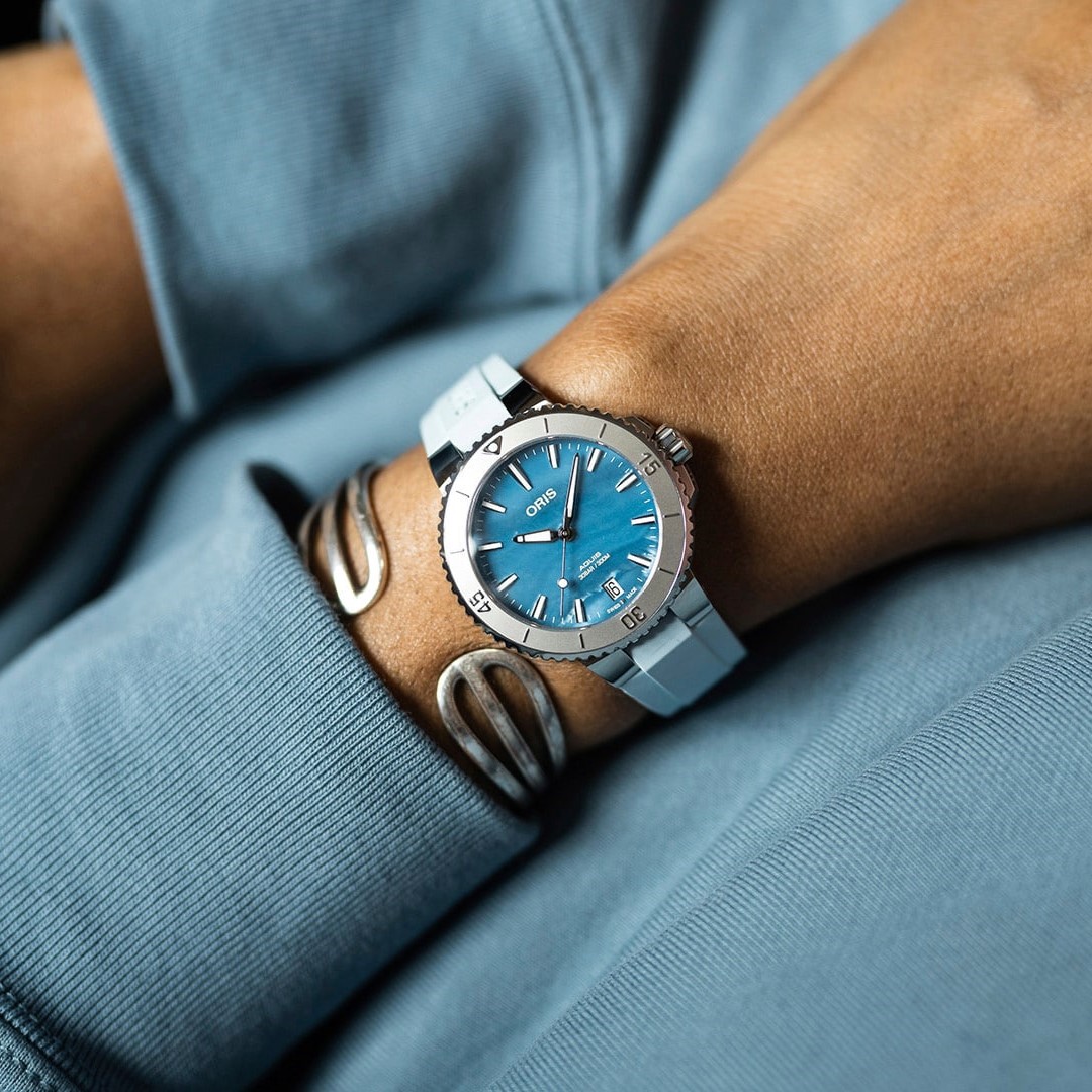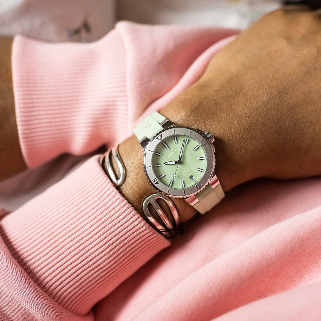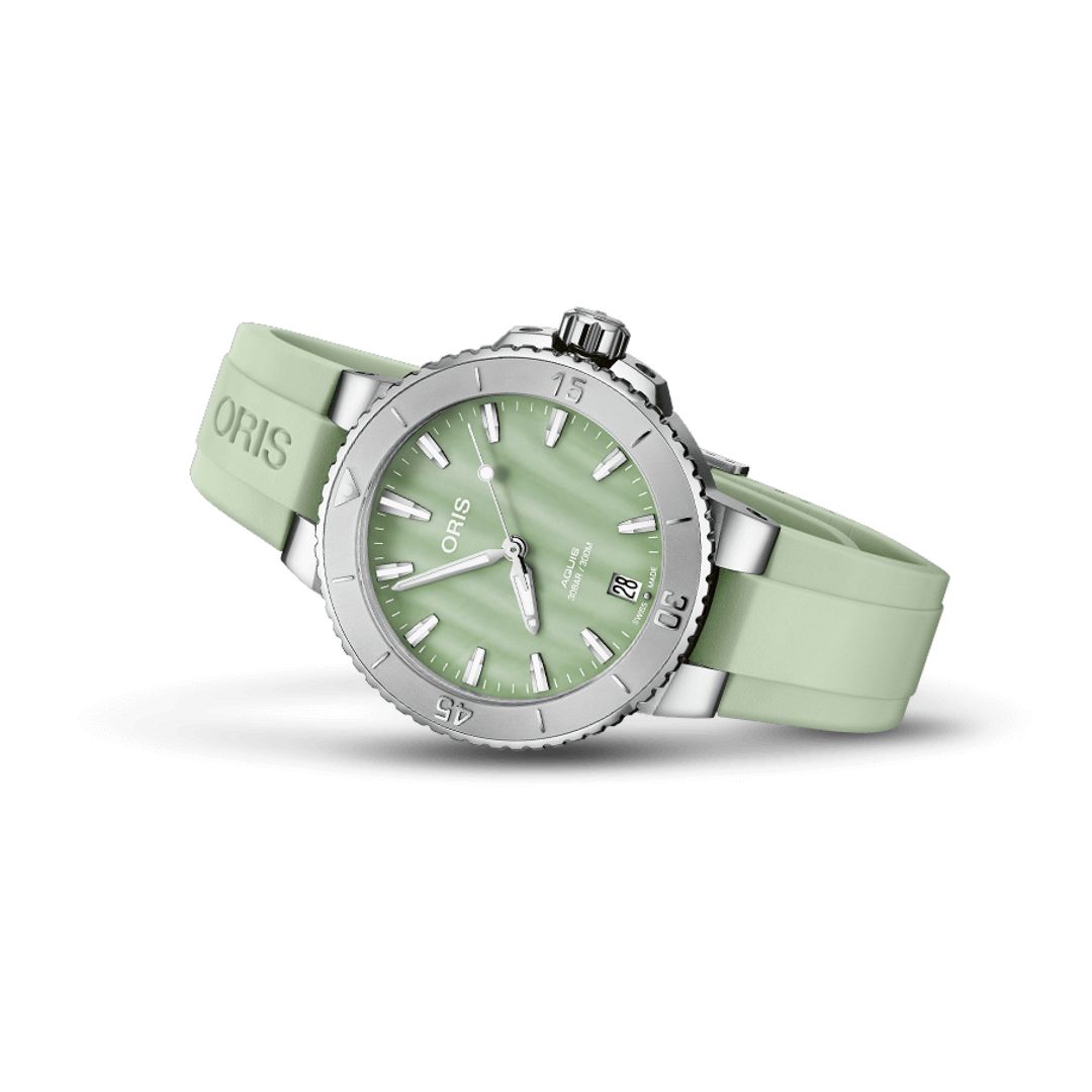 La montre de plongée Aquis Date, de couleur rose, se distingue par son cadran contrasté. Le cadran, réalisé en nacre, scintille comme le reflet du soleil sur l’eau, ajoutant de l’élégance à son profil performant. Cette montre, avec sa silhouette épurée, est une pièce unique dans la collection Aquis.