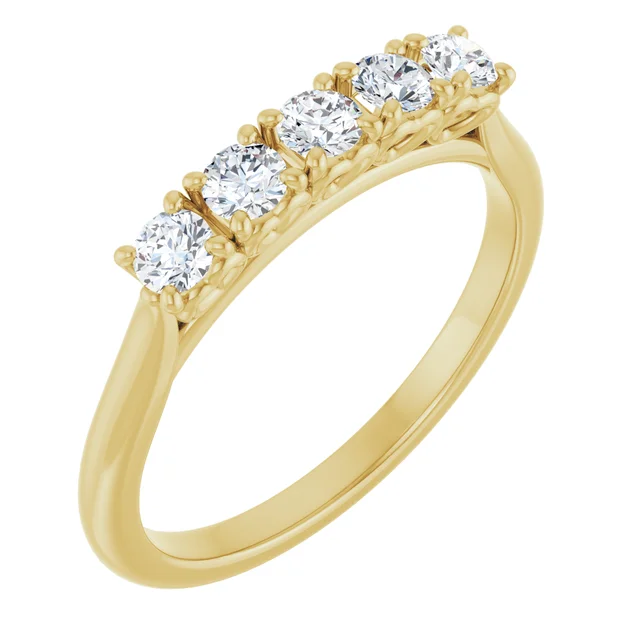 Création artisanale de l’atelier Golaz. Bague en or blanc avec 5 diamants cultivés en laboratoire, serti griffes et arborant discrètement des cœurs sur les côtés.