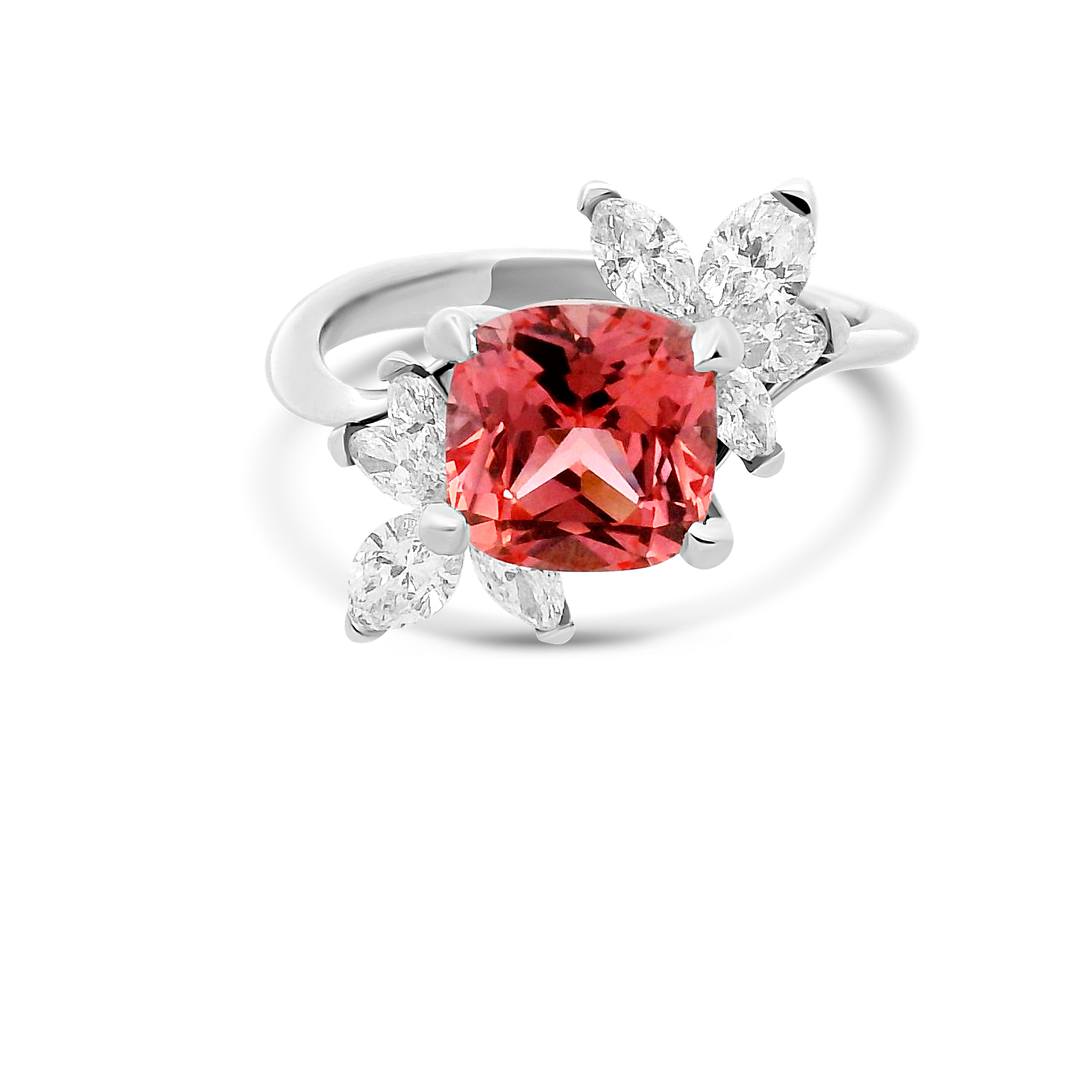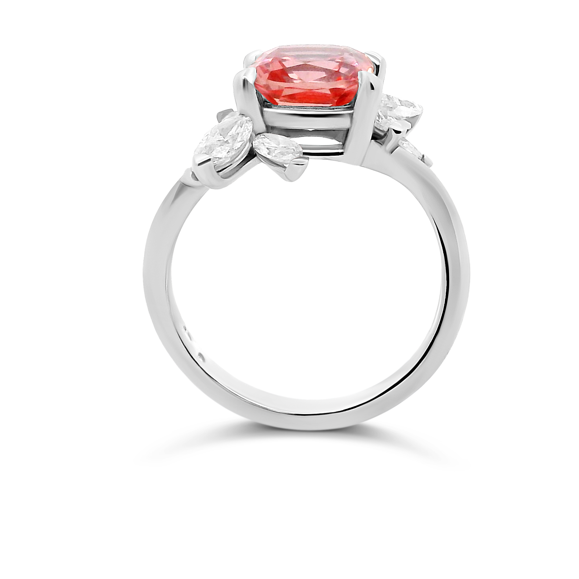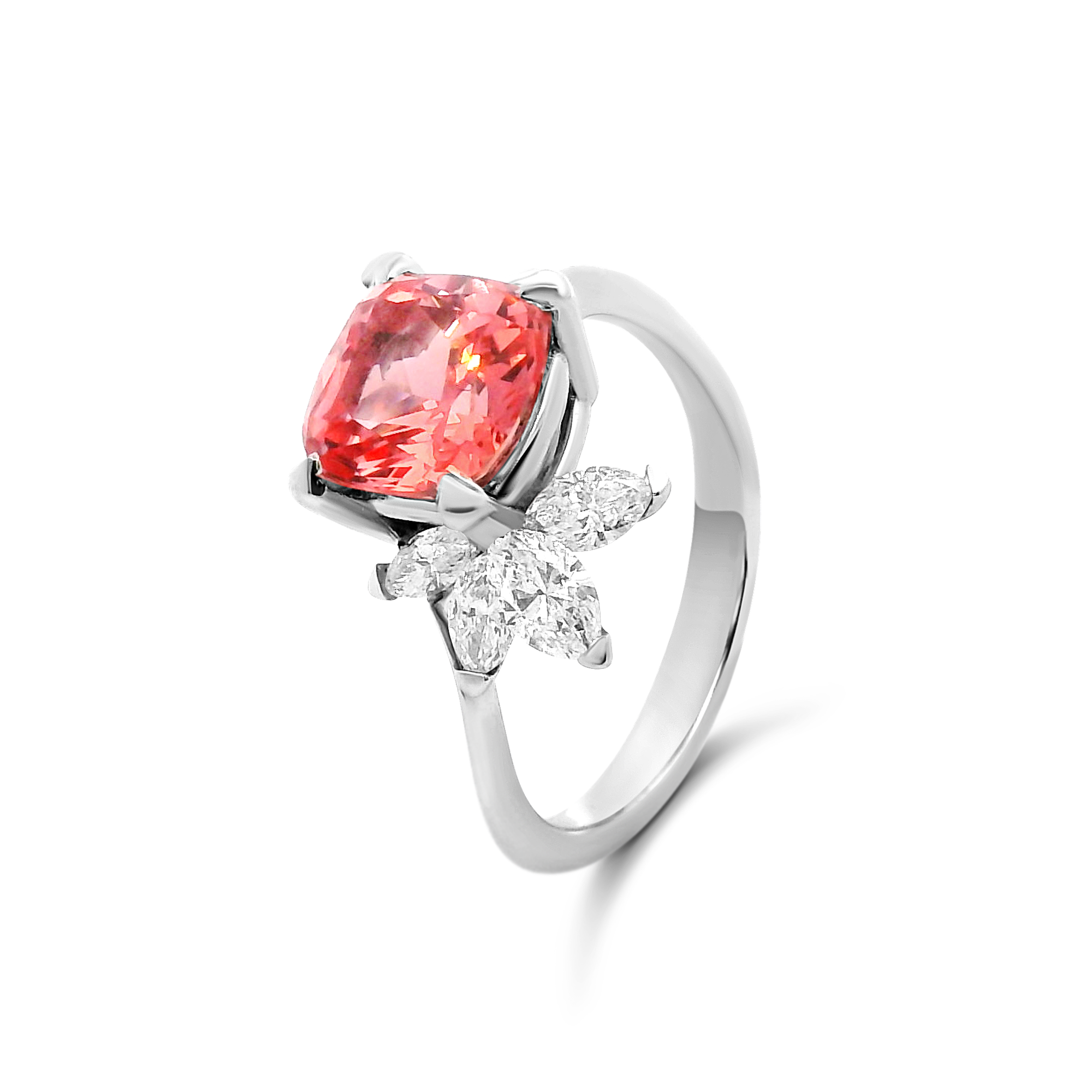 Création artisanale de l’atelier Golaz. Saphir Padparacha de culture taille coussin monté sur bague or blanc et rehaussé de 6 diamants de culture taille marquise