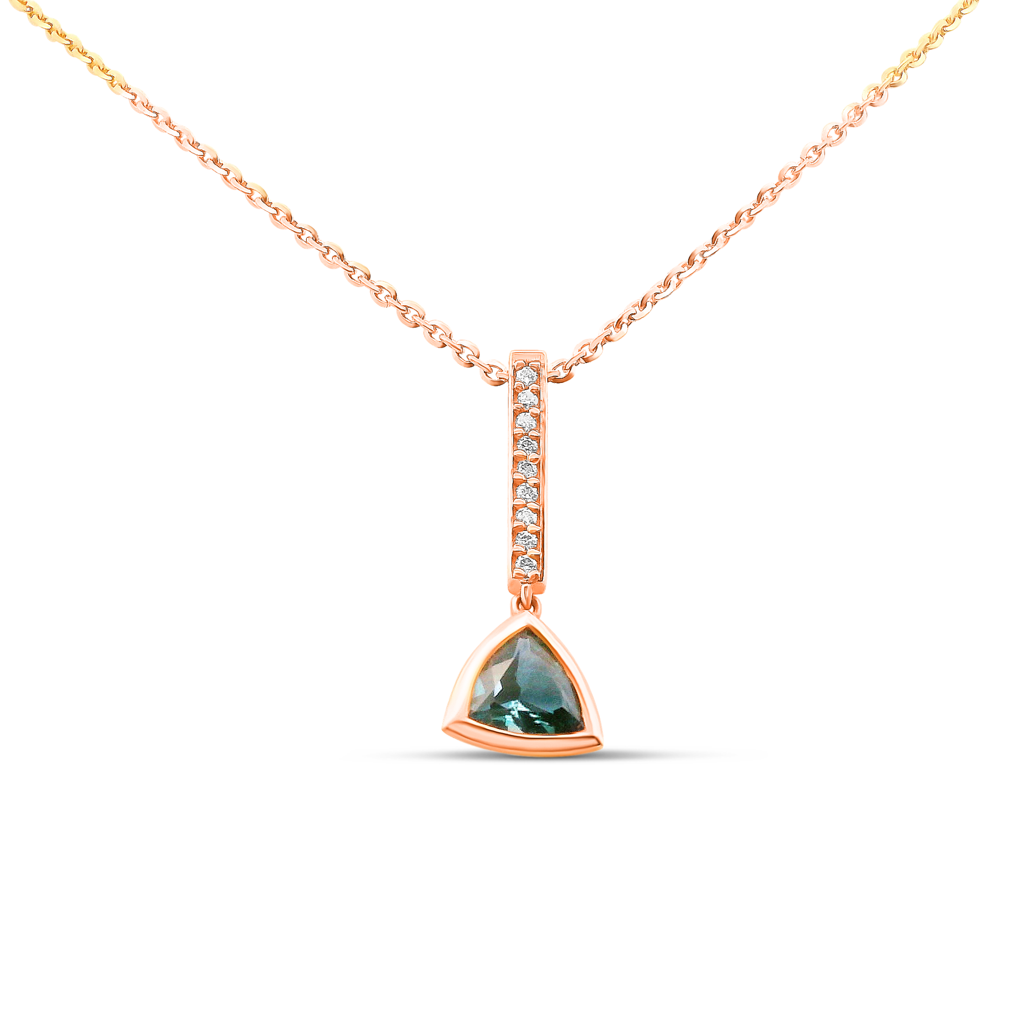 Création artisanale de l’atelier Golaz. Collier or rose maille forçat avec un pendentif arborant une alexandrite de culture de forme trillant dans un serti clos mobile et rhaussée de diamants de laboratoire