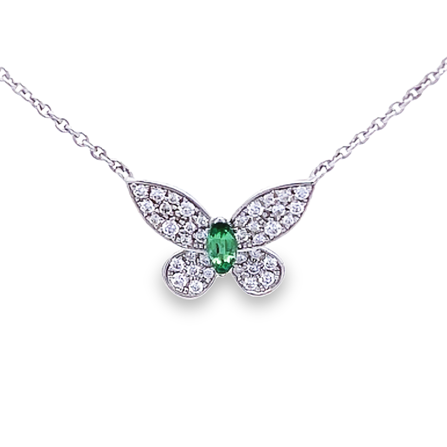 Création artisanale de l’atelier Golaz. Magifique papillon stylisé, monté en collier et serti de 38 diamants et une tsavorite taille navette