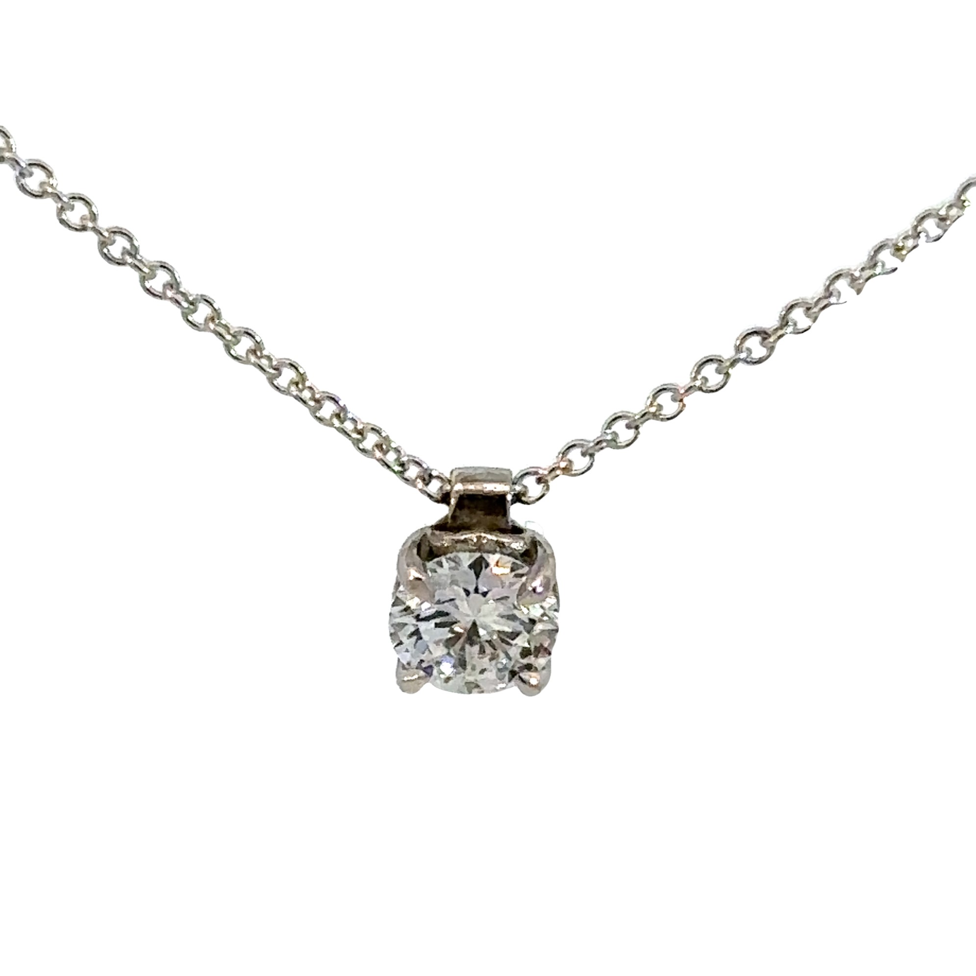 Création artisanale de l’atelier Golaz. Collier solitaire maille forçat en or blanc orné d’un diamant d’origine canadienne certifiée et serti dasn un chaton 4 griffe arborant un subtil coeur de chaque côté