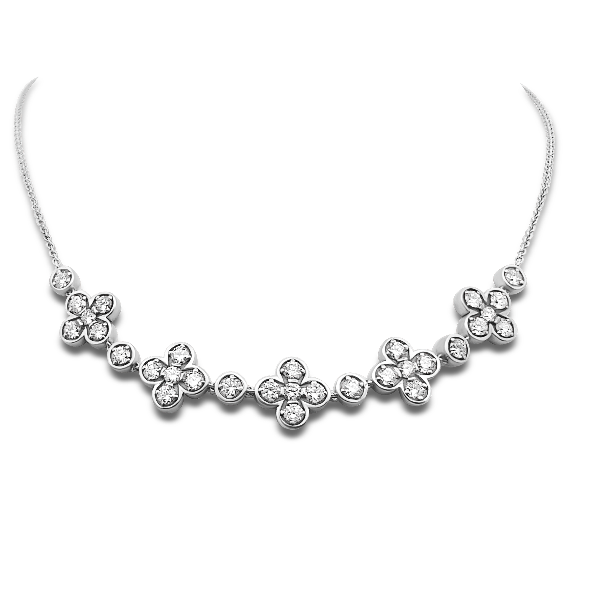 Création artisanale de l’atelier Golaz. Collier en or blanc avec 5 motifs en forme de trèfles à 4 , serti de diamants cultivés en laboratoire