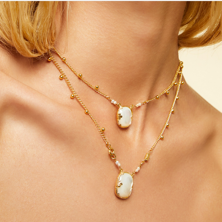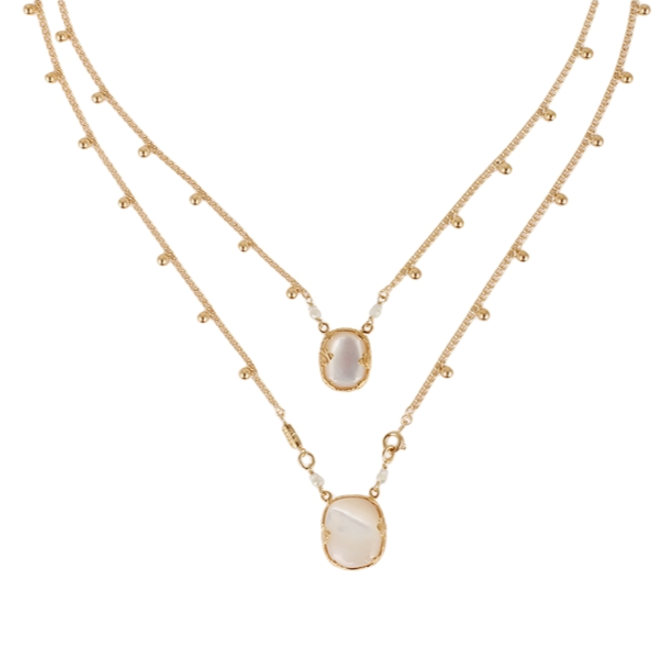 Collier scapulaire composé d’une chaîne plaquée or et de médailles en nacre blanche.