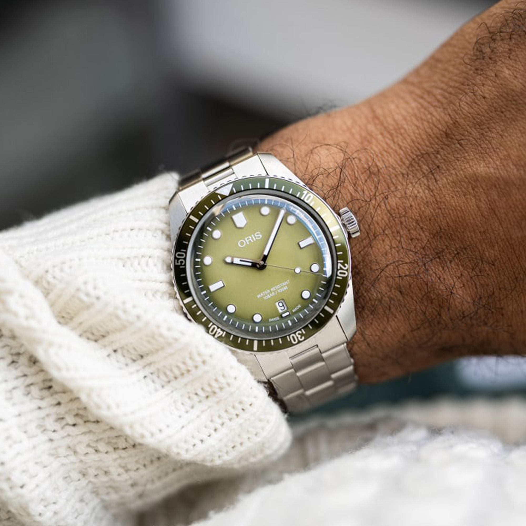 Cette Divers Sixty-Five s’inspire des teintes vertes des forêts qui entourent notre maison à Hölstein, au cœur de la vallée de Waldenburg. Le cadran vert se trouve dans un boîtier en acier inoxydable de 40 mm sur un bracelet métallique à trois maillons.