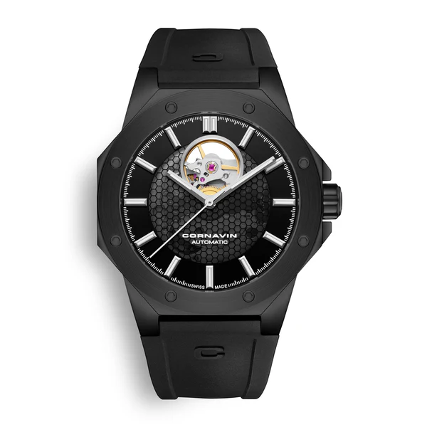 La Cornavin OH.04.R est une montre Swiss Made dotée d’un mouvement automatique Open Heart. Le verre saphir à l’avant comme à l’arrière protège la montre et offre une vue fascinante sur le mouvement depuis les deux côtés. Le cadran noir semi-transparent est décoré d’un subtil motif en nid d’abeilles. L’ouverture à 12 heures dévoile le balancier du mouvement automatique.