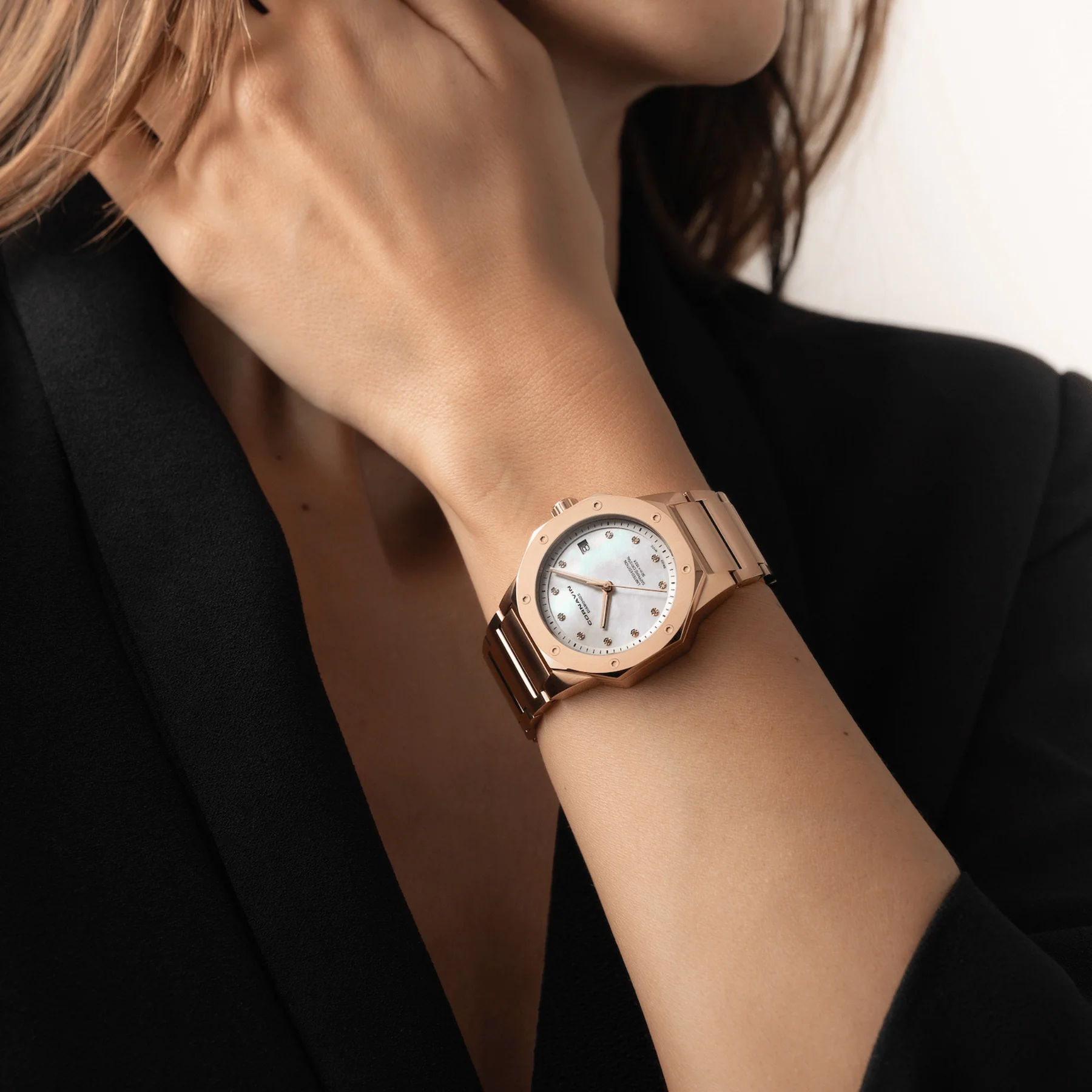 La collection Downtown Sky allie féminité et élégance sportive, résumant parfaitement l’ADN de Cornavin. La Cornavin CO.SKY.11D.B, avec son captivant cadran en nacre blanche et ses aiguilles lumineuses, offre à la fois précision et élégance. 11 diamants taille unique ornent le cadran, ajoutant une étincelle ludique à ce garde-temps exclusif. 11 diamants single-cut ornent le cadran, ajoutant une étincelle ludique à ce garde-temps exclusif. Le boîtier de 36 mm en acier inoxydable revêtu de PVD or rose, avec ses cornes légèrement incurvées, s’adapte parfaitement au poignet, garantissant ainsi le confort.