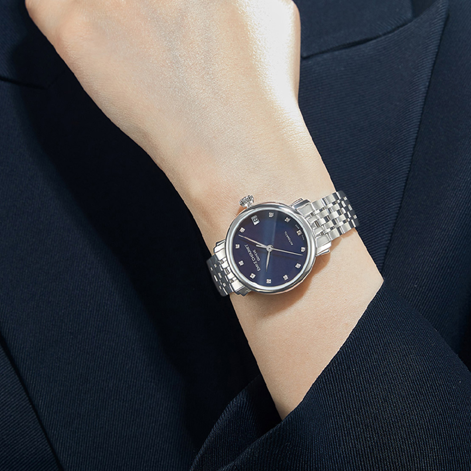 La Lac Léman Lady d’Émile Chouriet incarne l’élégance intemporelle de l’horlogerie suisse dans un format délicat de 30 mm. Avec son boîtier en acier inoxydable elle allie raffinement et sobriété. Animée par le calibre automatique EC9312, elle offre une réserve de marche de 42 heures et une fonction date discrètement positionnée à 3 heures. Son fond transparent révèle la finesse de son mouvement, tandis que son étanchéité jusqu’à 30 mètres assure une utilisation quotidienne en toute sérénité.