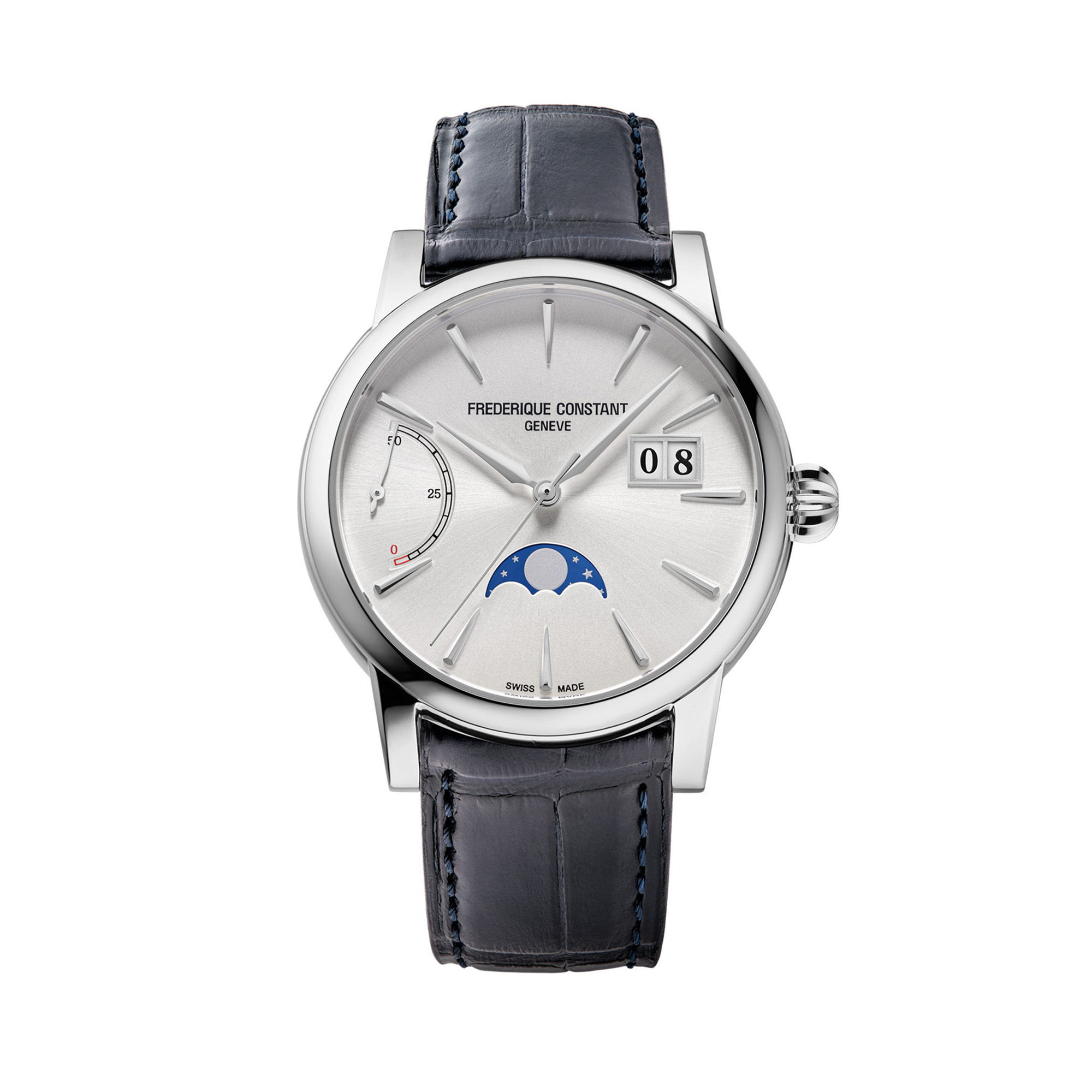 La Classic Power Reserve Big Date Manufacture donne vie au 31e calibre Manufacture de Frederique Constant. Son nom : FC-735. Il est le premier de la Maison à offrir une grande date, une phase de lune ainsi qu’une réserve de marche, nourries par une autonomie aujourd’hui portée à 50 heures. Celle-ci est dorénavant indiquée à 9h par une fine aiguille dédiée qui parcourt un arc de cercle segmenté de 0 à 50, terminé par une zone rouge indiquant qu’il est temps de remonter sa montre avant qu’elle ne s’arrête.
