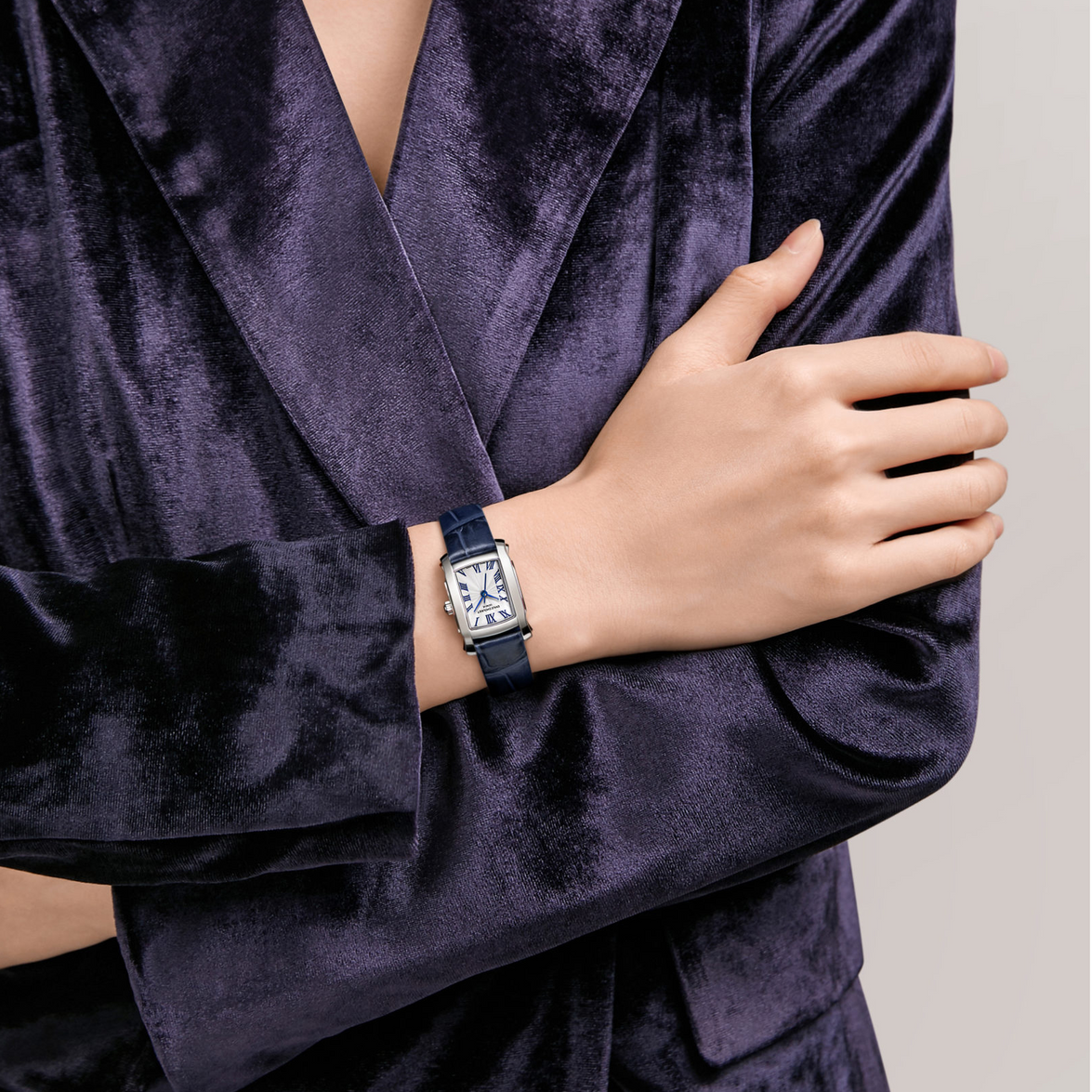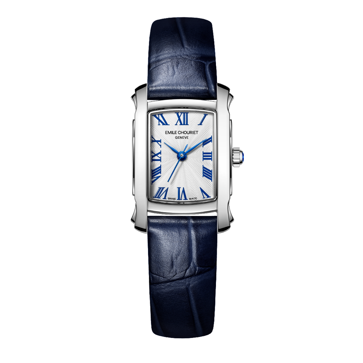 La Odyssée se distingue par son boîtier rectangulaire en acier inoxydable de 23,4 x 20,1 mm, aux lignes courbes et aux cornes en forme d’ailes, signature de la maison Emile Chouriet. Son cadran blanc guilloché, orné de chiffres romains peints et d’aiguilles feuilles colorées (bleues, rouges ou vertes), offre une lisibilité optimale et une touche de couleur subtile. La couronne est sertie d’un cabochon assorti, ajoutant une note de sophistication