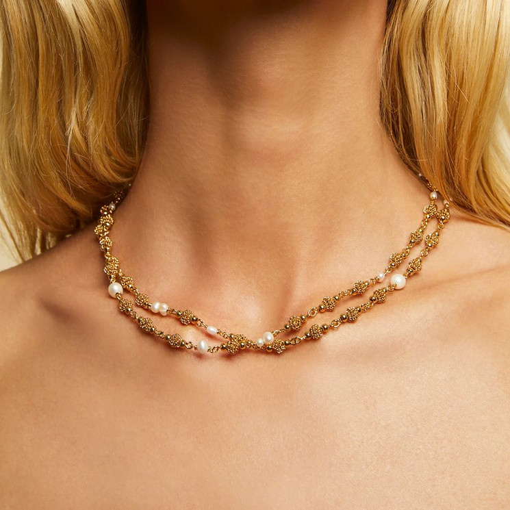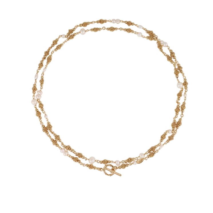 Sautoir plaqué or composé de perles en nacre blanche et de perles plaquées or.
